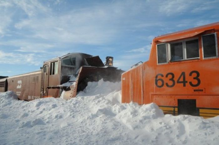 This train looks very unusual. It is used as a snow blower machine that cleans railways from snow. Take a look at how it works.