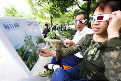 Probably because of the movie Avatar, people in China are really in love on 3D staff. A newspaper that was issued in Hangzhou, Zhejiang Province, came out in 3D edition. Readers can see 3D pictures with 3D glasses that were attached with it. Well, this is not the first 3D newspaper which can found in China. In April, a newspaper from Shiyan city, Hubei Province, has made it the first. Looks like the printing technology for newspaper in China has made some breakthrough.